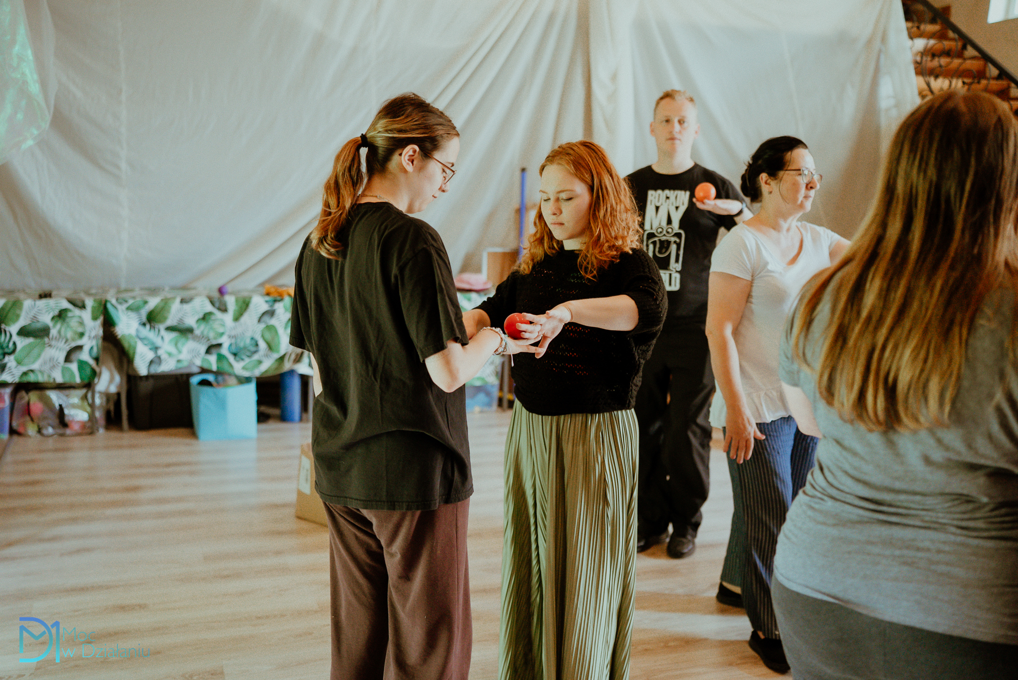 Doskonalenie warsztatu cyrkowego – kolejne dni treningu pozwoliły na szlifowanie techniki: od płynniejszej żonglerki, przez bardziej skomplikowane układy z flowerstickiem, aż po odważniejsze ewolucje na szarfie. To, co wcześniej sprawiało trudność, teraz stawało się źródłem satysfakcji.