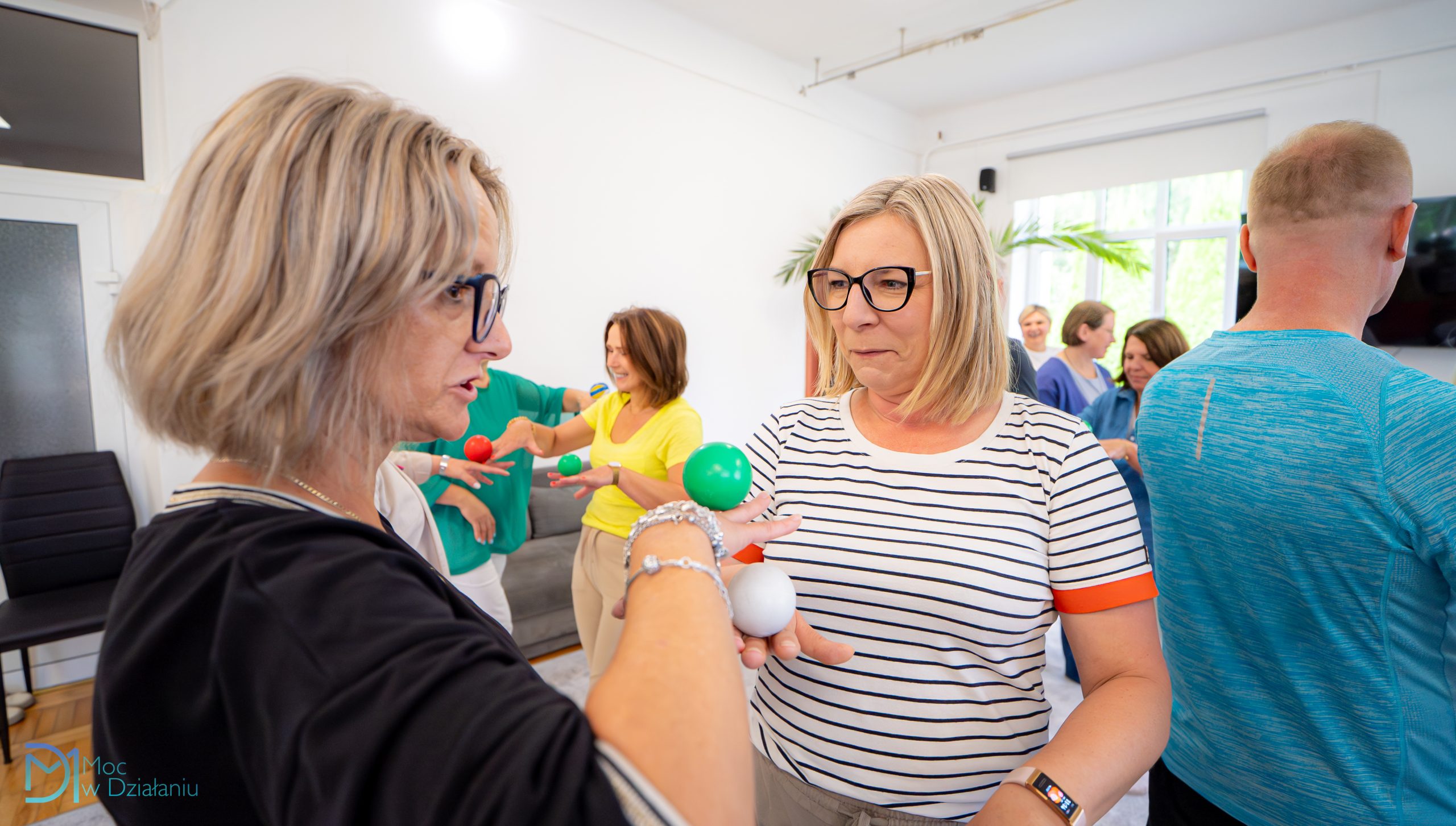 Przeciwdziałanie wypaleniu – warsztaty były także czasem regeneracji dla samych pedagogów; wspólna zabawa i kreatywny ruch to doskonała metoda na redukcję stresu zawodowego.