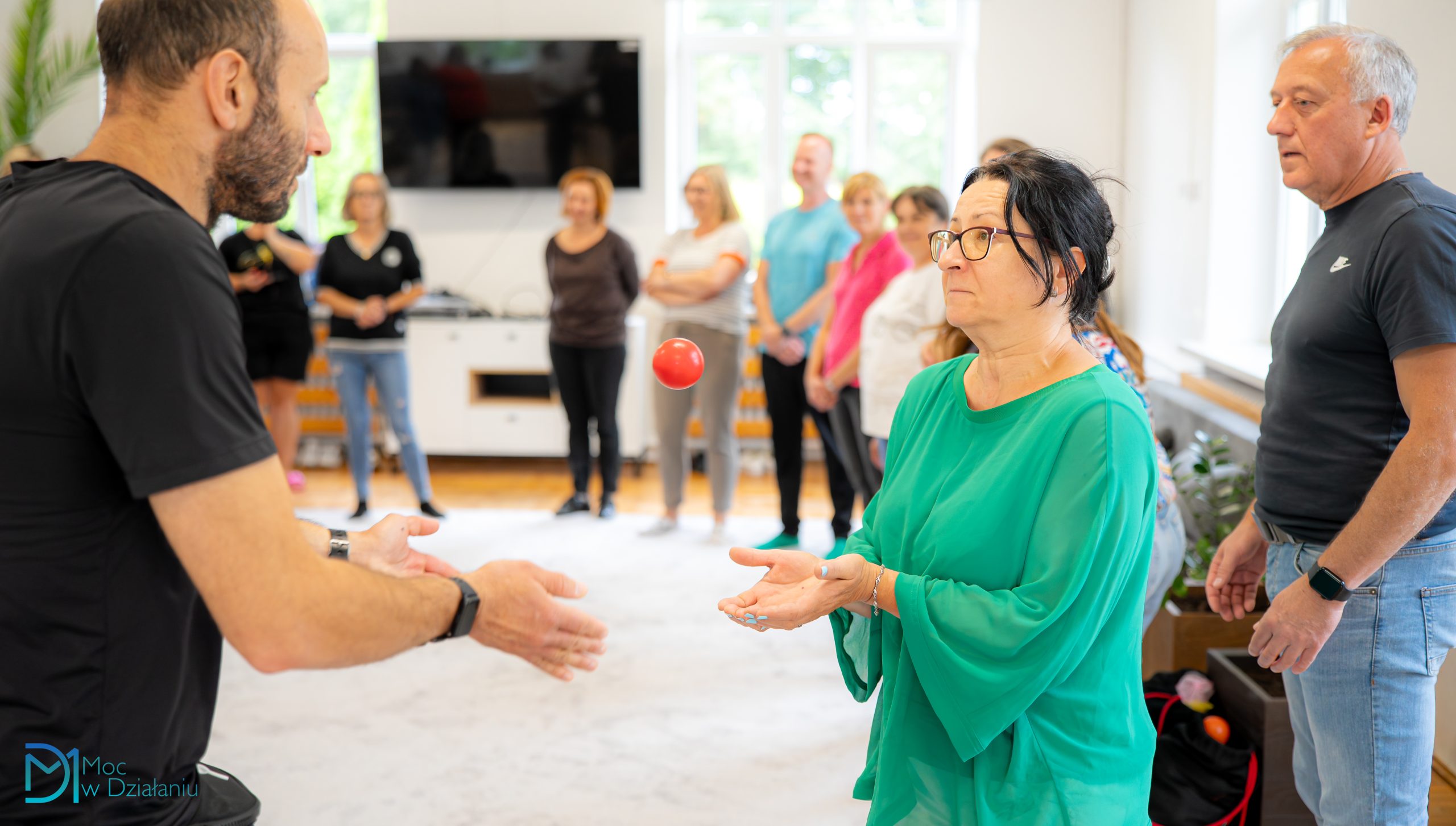 Warsztat profesjonalnego animatora – seniorzy zdobyli praktyczne umiejętności prowadzenia gier i zabaw, ucząc się, jak zarządzać grupą i utrzymywać uwagę uczestników w różnym wieku.